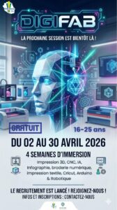 FABLAB • IMMERSION • DIGIFAB Les inscriptions sont ouvertes pour la prochaine session DIGIFAB Une nouvelle session du programme DIGIFAB se déroulera du 2 au 30 avril 2026. Ce parcours d’immersion gratuit de 4 semaines permet aux participants de découvrir...